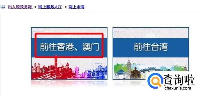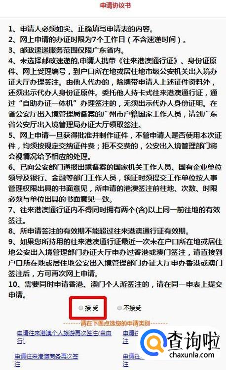 到下一步,选择前往香港、澳门。然后进入到下一个页面是办理的申请协议书,请您在仔细阅读之后选择同意然后在下面选择你的申请类别。