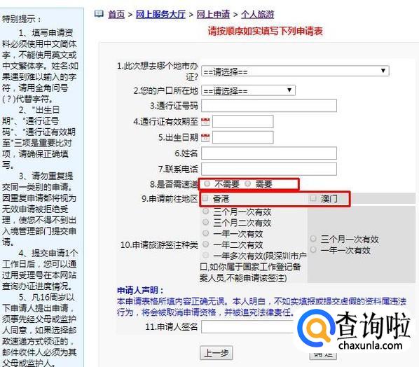 然后就进入下一个页面,填写你的资料信息,第八点和第九点需要注意,通行证是否需要快递给你,填写去香港还是澳门时请仔细。然后点击确定。