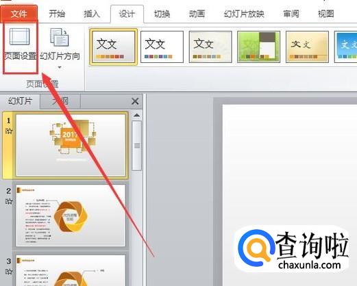 在“设计”选项线面的工具栏中找到“页面设置”,点击并进入,如图所示。