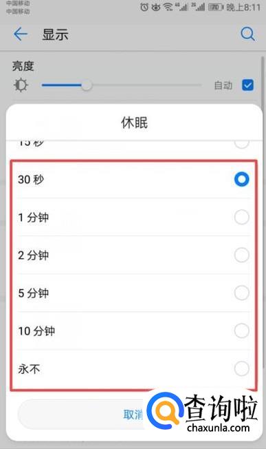 弹出的界面,我们选择一个休眠时间就可以了,还是比较简单的,相信大家现在都会了。
