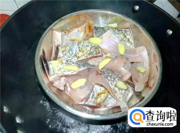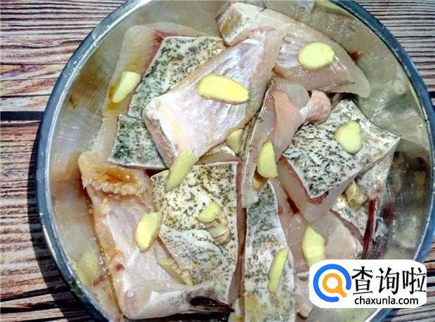 把姜片均匀铺在鱼腩上,腌制一小会。