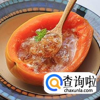 将蒸好的桃胶倒入木瓜中,再倒入牛奶,放上适量冰糖,