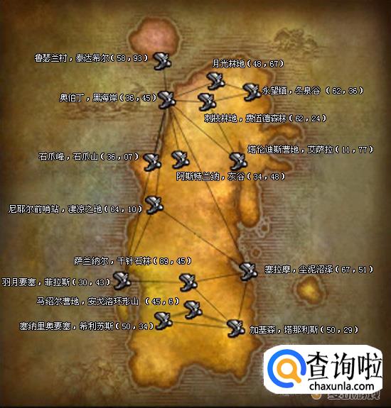 在卡利姆多大陆的地图上找到一个叫灰谷的地方。灰谷里面有联盟和部落的飞行点,联盟的在阿斯特兰纳,部落的在碎木哨岗和地图最左边的佐拉姆海岸下面。