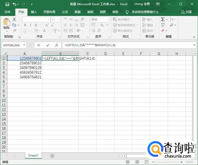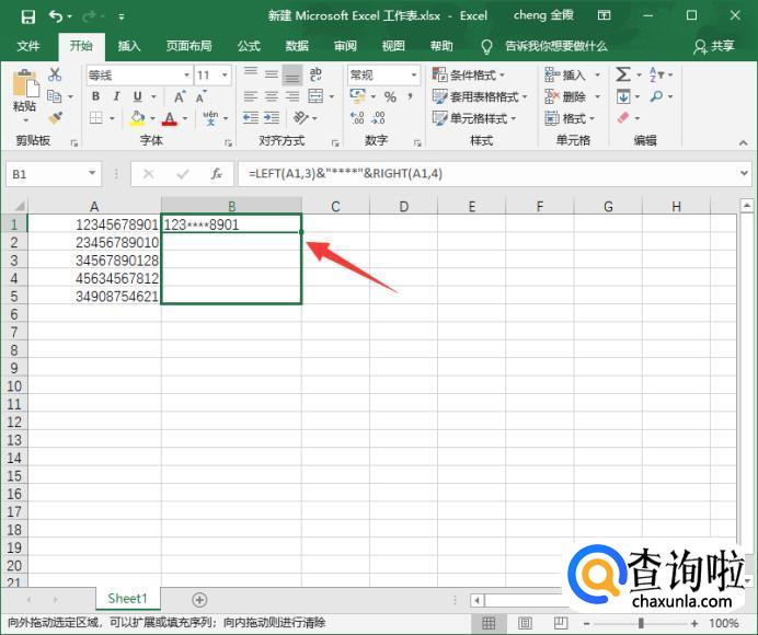 我们在B1单元格输入公式【=LEFT(A1,3)&"****"&RIGHT(A1,4)】