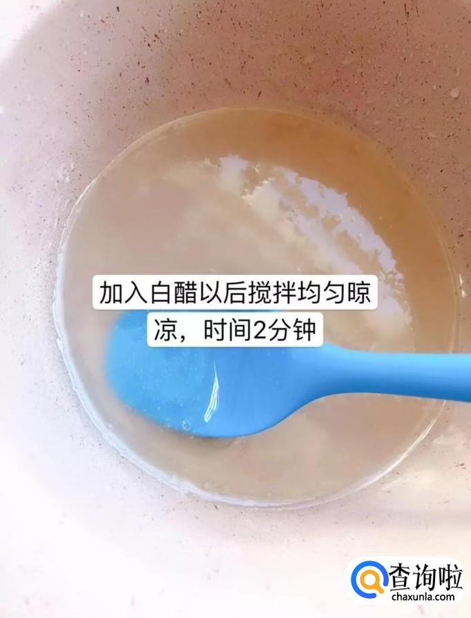 加入白醋以后搅拌均匀晾凉,如下图所示。小贴士:晾凉的过程大概两到三分钟左右就可以了。