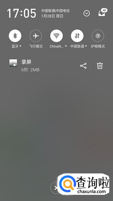 点击录屏之后点击开始、结束即可进行录屏,录制完成之后即可在通知栏显示相应的录屏文件。