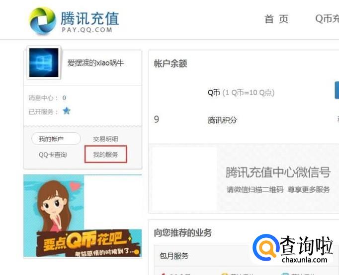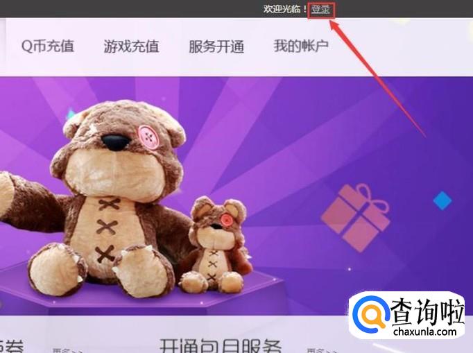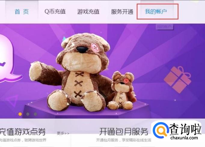 进入腾讯充值中心页面之后,点击页面顶部“登录”按钮,并使用QQ号码登录,登陆成功之后,点击“我的账户”菜单。