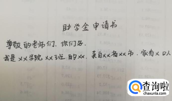 在居中的位置写上助学金申请书,再另起一行顶格写上“尊敬的/敬爱的老师,你们好”。再起一行,空两格写上我是xx学院xx专业xx班的xx,来自xx省xx市,家有x口人只要好好说明自己的家庭情况就行了。