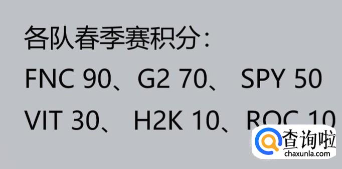 目前六支队伍春季赛积分,FNC 90,G2 70,SPY 50,VIT 30,H2K10,ROC10