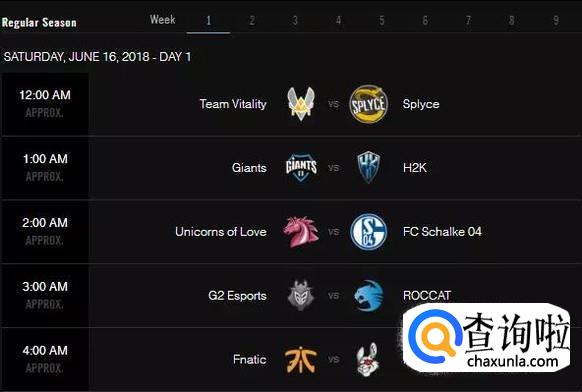 常规赛共9周,分别在北京时间每周六的凌晨0点和晚上11点进行