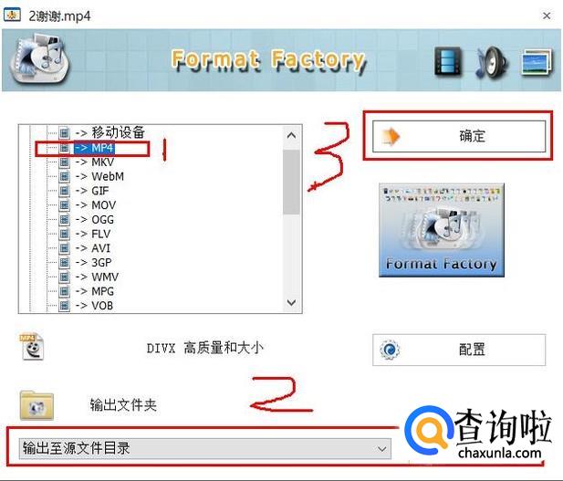 选择MP4格式,2选择文件输出位置,3单击确定。
