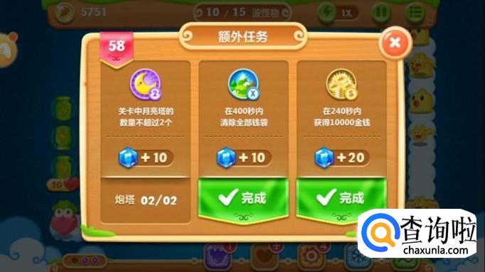 查看额外任务。这一关的三个额外任务:1.关卡中的月亮塔不超过两个。2.在400秒内清除全部钱袋。3.在240秒内获得10000金钱。第二三个任务都是关于打钱的,看来这一关快速清除钱袋十分重要。