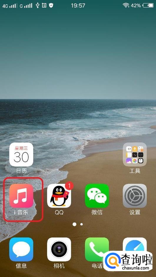 首先,打开手机,在主界面上找到“i音乐”图标,并点击一下。