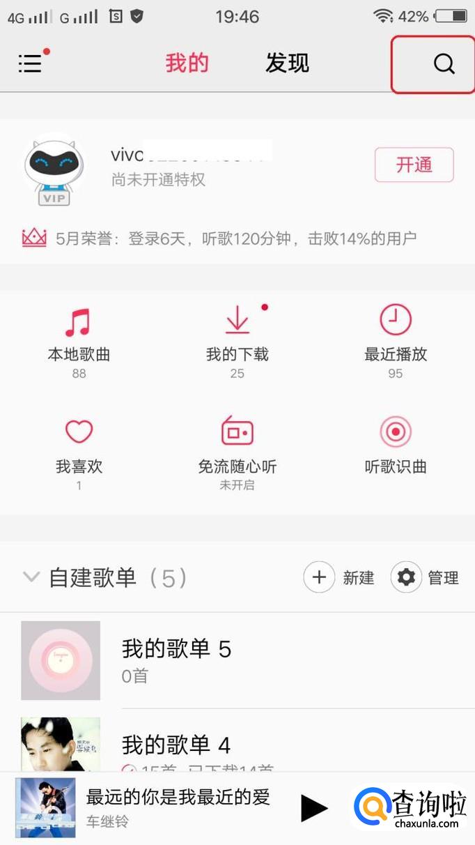 如图所示,进入我的音乐界面,点击右上角搜索图标。