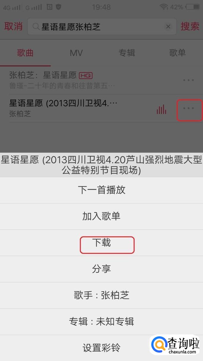 如图所示,点击歌曲后面的扩展按钮,会弹出菜单,在菜单里面选择下载就可以了,下载的歌曲会自动保存到手机存储里面的“i音乐”文件夹里面。