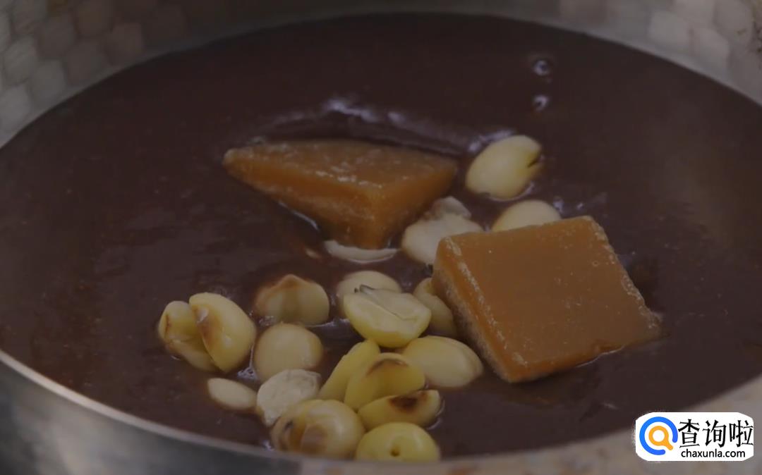 在红豆沙中加入莲子和黄片糖,再煮5分钟。这样陈皮红豆沙就做好了。
