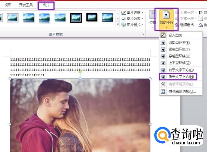 插入后,我们在工具栏中看到格式,然后点击自动换行的下拉箭头,弹出的界面就是环绕方式,我们选择浮于文字上方;