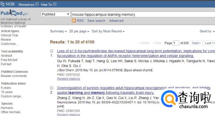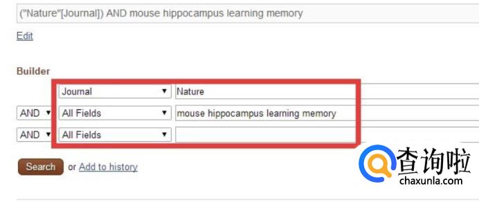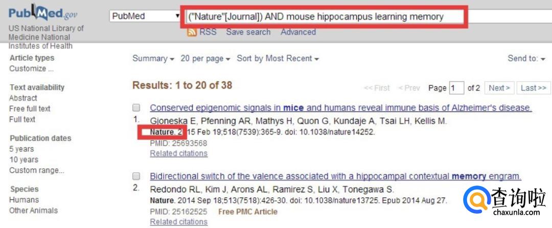 这里以“Nature”为例,在“Journal”上搜索“Nature”,然后在“All Fields”中输入“"mouse hippocampus learning memory””,然后再搜索,就可以得到在Nature的相关论文。