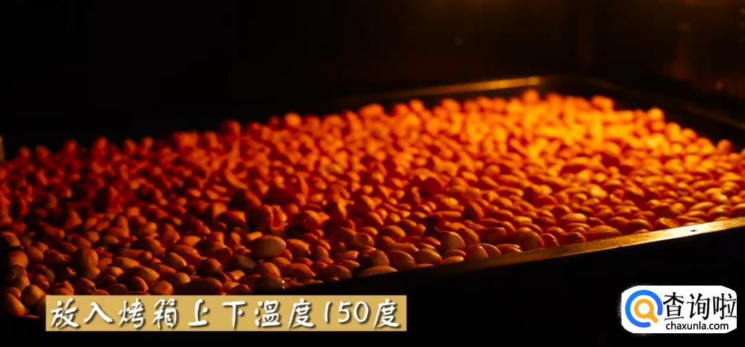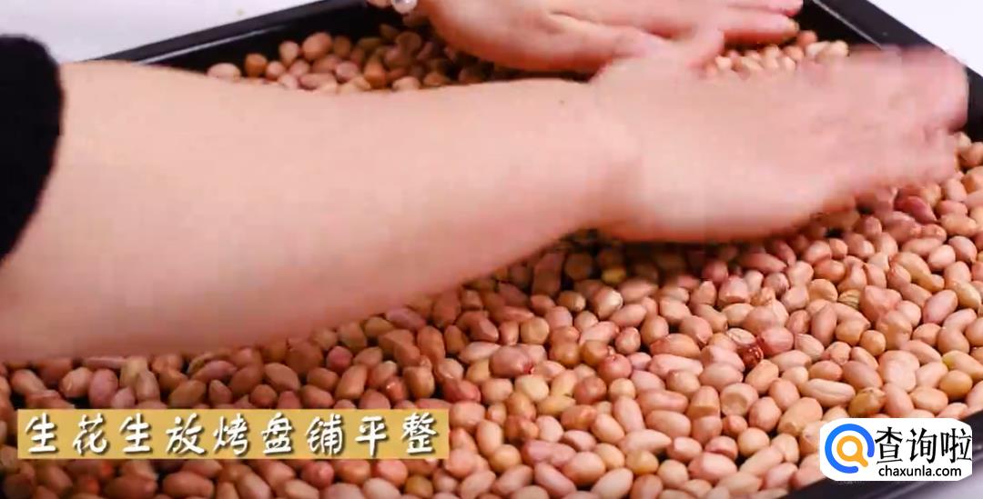 将生花生放入烤盘中,并铺平整。