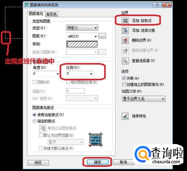 之后,我们还需要设置一下比例,如图所示,设置比例为5(我是根据经验设置的,可以根据视觉效果调整数值),点击“添加拾取点”,选中方框,至出现图中虚线样式后,点击确定,第一种图案就填充进去了,效果如下。
