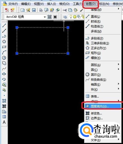 我们知道,CAD中自带图案填充是没有钢筋混凝土的,不过我们可以用两个图案重叠的方式填充进去,也能得到钢筋混凝土图案的效果。如图所示,选中方框后,点击“绘图”标签,在下拉菜单中选择“图案填充”。