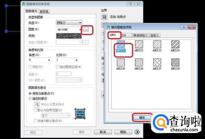 弹出“图案填充与渐变色”选项框,我们点击图中图案旁边的按钮,选择图案种类,选择ANSI下面的ANSI31,点击“确定”。