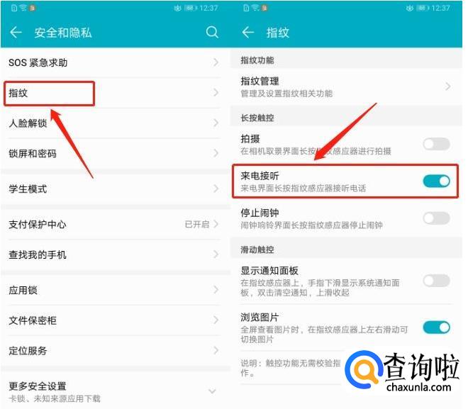 设置方法:打开手机“设置”,找到“安全与隐私”,点击“指纹”,把“来电接听”功能打开