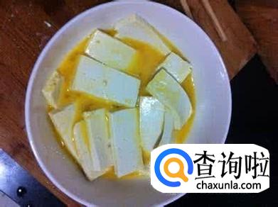 把鸡蛋倒在碗里面,然后用筷子混合均匀,再把切好的豆腐块放在蛋液里面,让豆腐的表面沾上蛋液。
