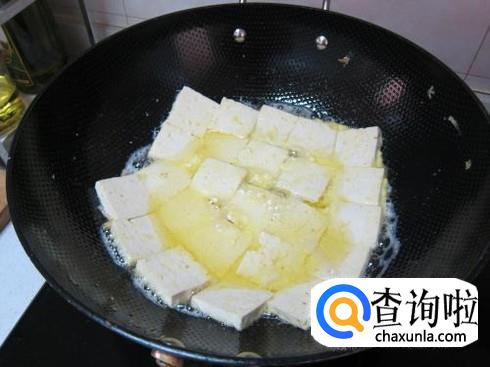 往锅里加入适量的油,等到油熬热以后就把蘸上蛋液的豆腐放在油锅里面煎,至豆腐两面都为金黄色的时候就可以盛出来。