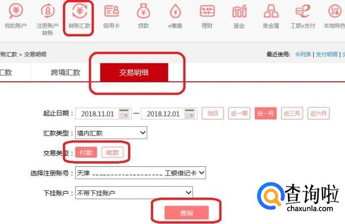 登录之后,就进入了个人网银了,我们要查询转账回执单,就点击图中的“转账汇款”图标,然后点击其下的“交易明细”,然后输入起止时间、交易类型、账号,点击“查询”。