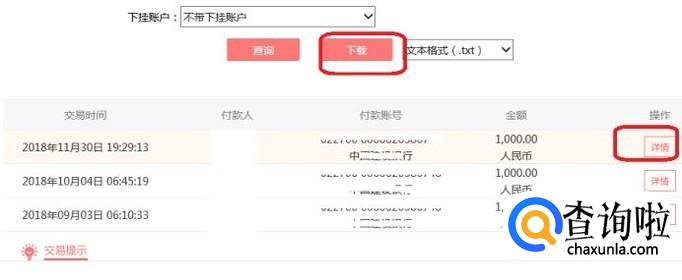 此时,就会显示查询结果,该时间段内的交易记录都会显示,,我们可以点击“下载”,下载交易记录,如果只是想查看单笔记录的话,就点击后面的“详情”按钮。