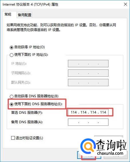 之后我们选中使用下面的DNS服务器地址,然后我们在里面输入114.114.114.114,之后我们点击确定,这样我们就解决了这个问题了。