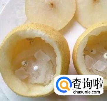 将泡好的川贝与冰糖同等比例混合后放入去核的雪梨中,再将雪梨顶盖上