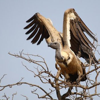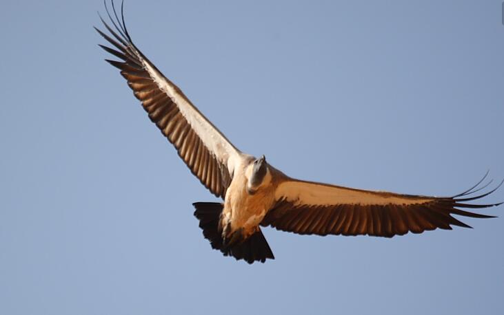 黑白兀鹫(学名:Gyps rueppellii):是一种大型非洲秃鹫,体长85-107厘米,翼展230-260厘米,体重6.4-9千克。雄鸟及雌鸟很相似,和其他秃鹰一样,在飞行中切割出一个独特的轮廓,它们具有宽大的翅膀,一个短方形的尾巴。头部凸裸,长长的脖子会折叠并卷入其身体。
