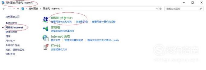 如图所示,唤出"网络和Internet"选项。选择"网络和共享中心"选项区域,点击"查看网络状态和任务"图标。
