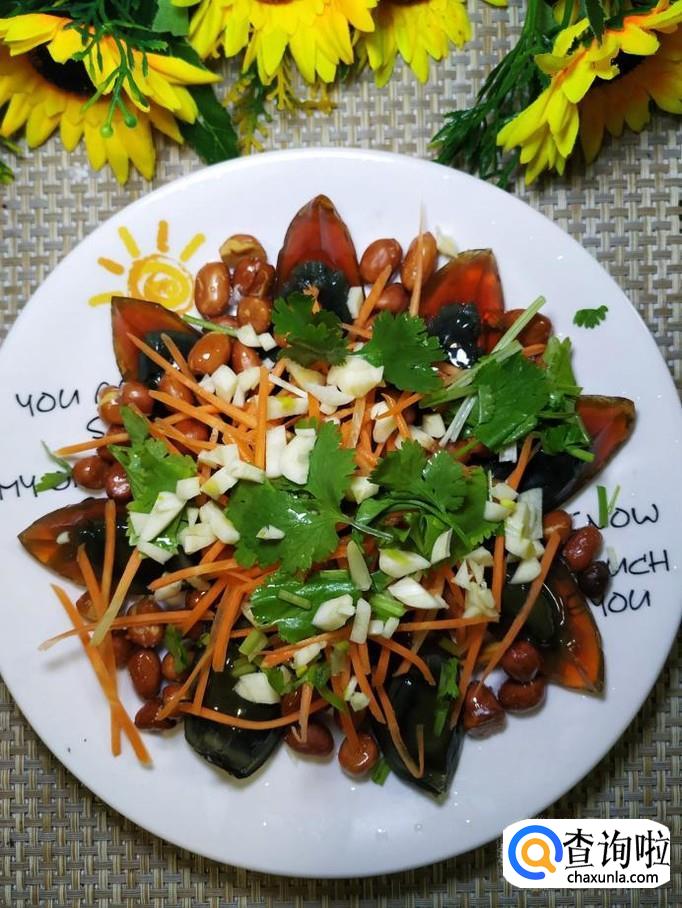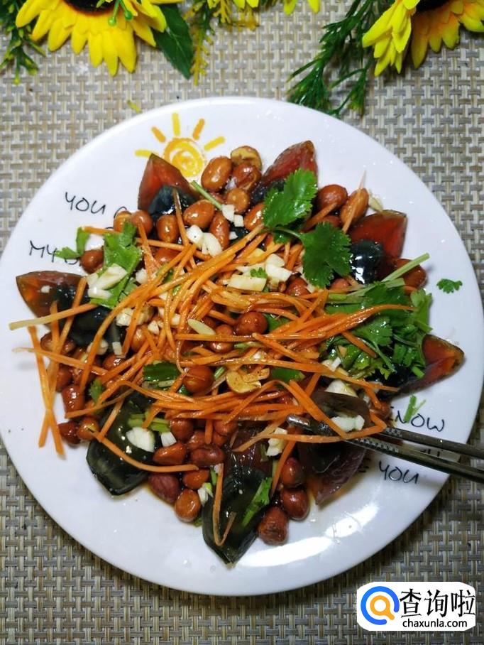 皮蛋适量,花生适量,胡萝卜适量,香菜适量,蒜适量,盐适量,鸡精适量,五香粉适量,生抽适量,陈醋适量,辣椒油适量,香油适量。