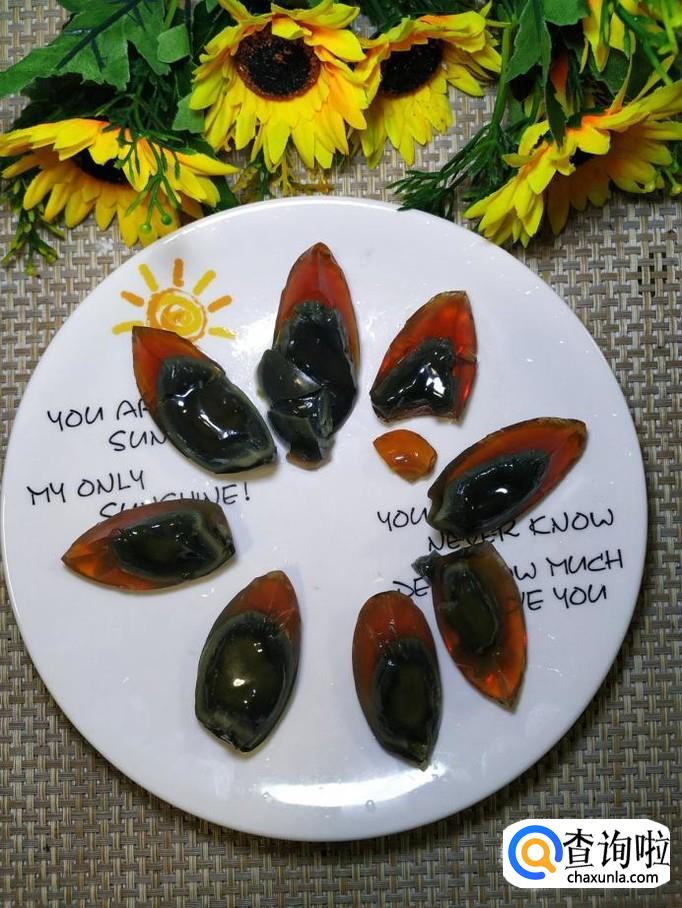 准备两个松花蛋,去除外皮,切成小瓣,放入盘中备用。
