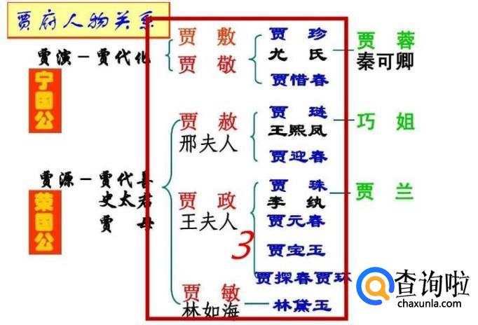 第二层为贾代化的儿女们,分别是贾赦(儿媳妇刑夫人),贾政(儿媳妇王夫人),贾敏(女婿林如海)。还有就是贾代化的儿女们,分别是贾敷,贾敬