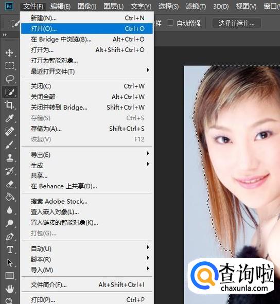好了,关键来了,点击文件打开我们的背景图,然后回到刚刚的图片,拖拽女生选区到背景图上。