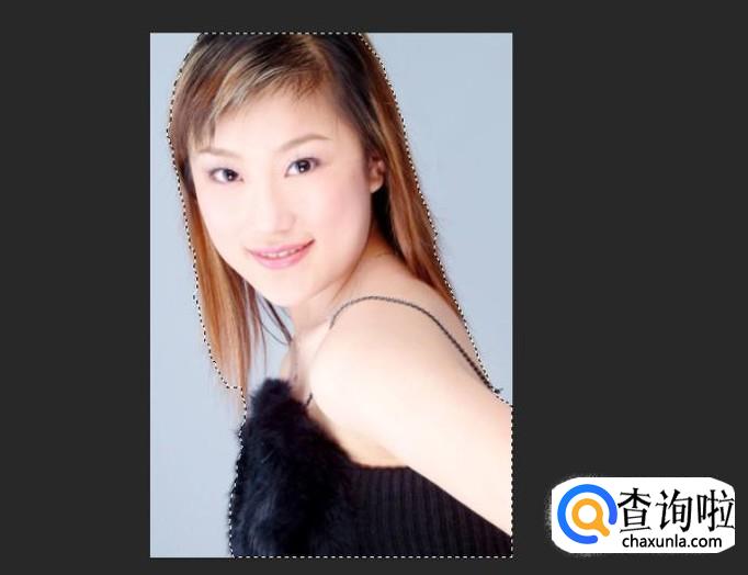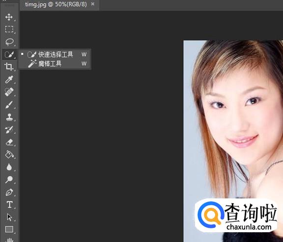 在工具栏选择"快速选择工具",拖动选择女生图像,直到她周围都布满蚂蚁线。