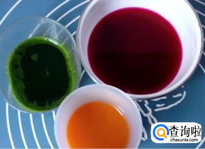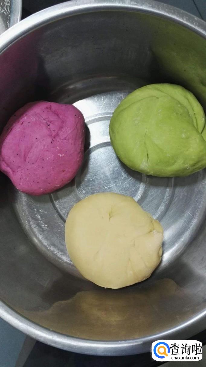 取三份等量适量的面粉,分别与三中蔬菜汁混合,加入少量盐,将三个颜色与面粉充分融合,揉成面团。将揉好的面团装袋醒一会儿。