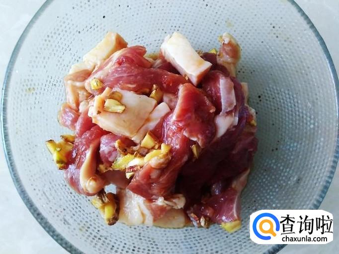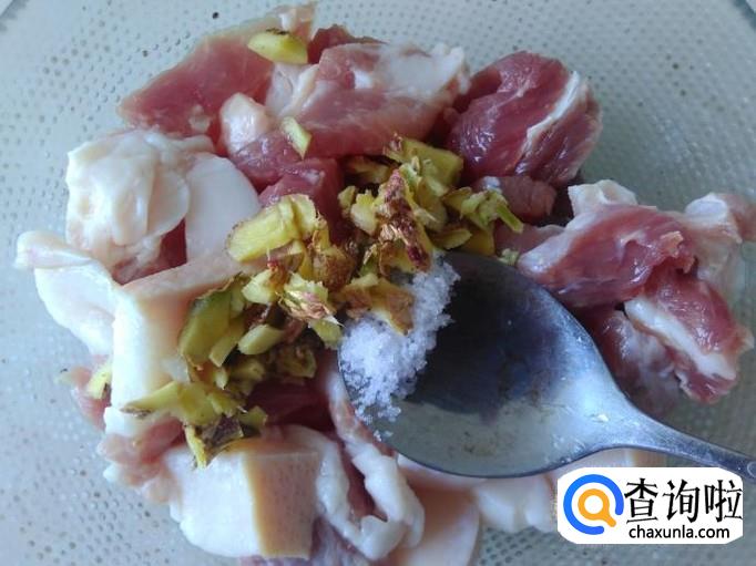 肉片里加适量的盐、姜蓉、1勺生抽、1勺料酒腌制几分钟。