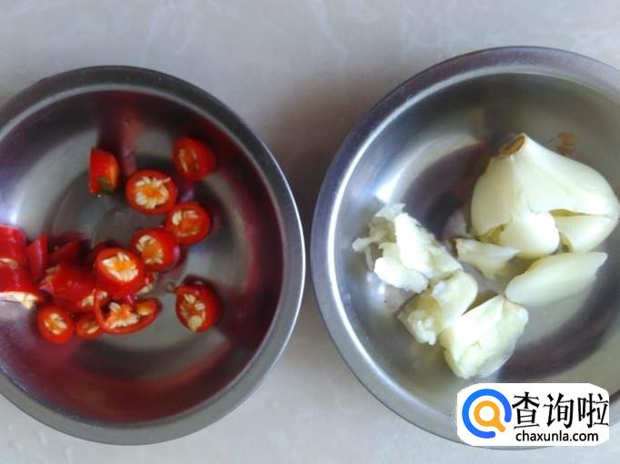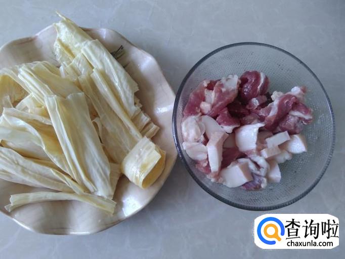首先把腐竹泡好,撕成一条条,猪肉切成片,蒜米、小米辣准备好。