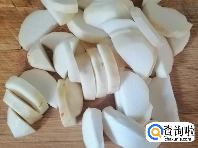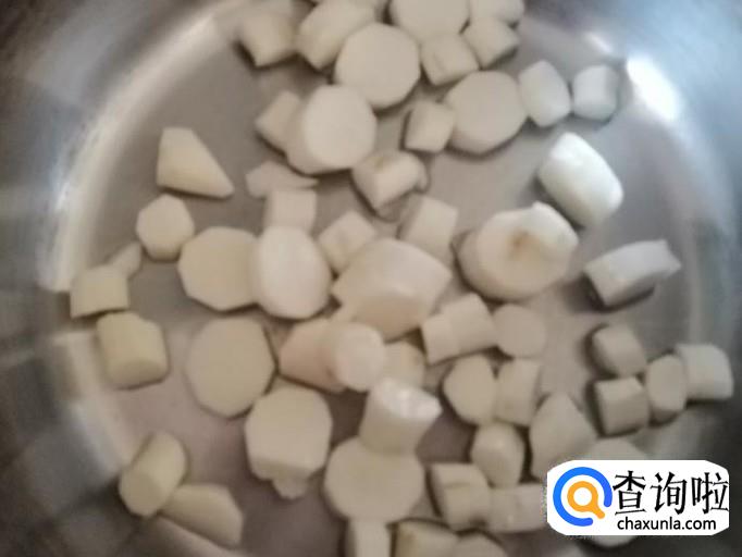 用菜刀先把山药切成小块,然后地瓜切成大块,因为地瓜比较容易熟,芋头切好片待用。