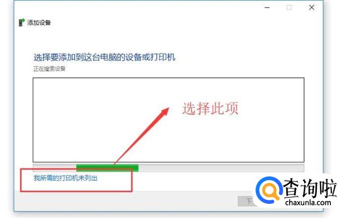 接下来会进入添加设备界面,系统会自动搜索附近的打印机,但是我们不需要等着它搜索,直接选择下面的链接即可,如下图所示