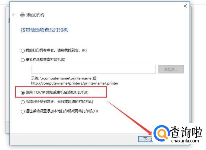 然后进入添加打印机的界面,我们选择第二个选项,运用IP地址进行添加,如下图所示