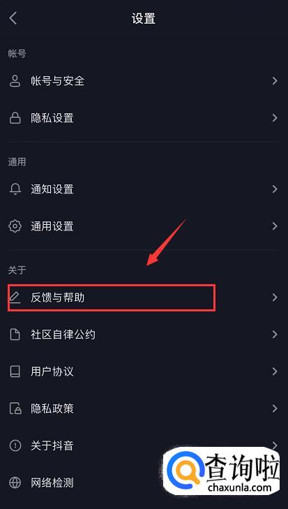 进入设置页面后,在“关于”一栏中找到【反馈与帮助】,点击进入。