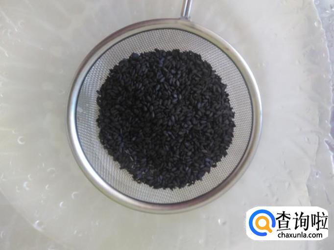 芝麻倒到过滤器里,然后放到水里清洗干净,捞上来沥干水份。