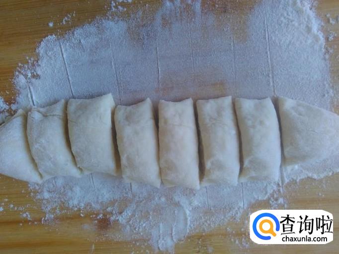 然后把发酵好的粉团放到案板上,撒点面粉搓成一长条,然后均匀地切成一段段。