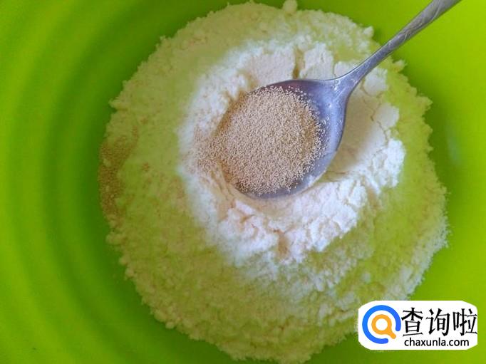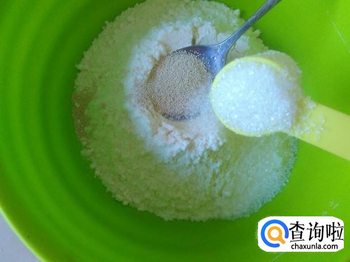把面粉放到盘子里,加酵母【酵母按说下料】,再加适量的白糖。